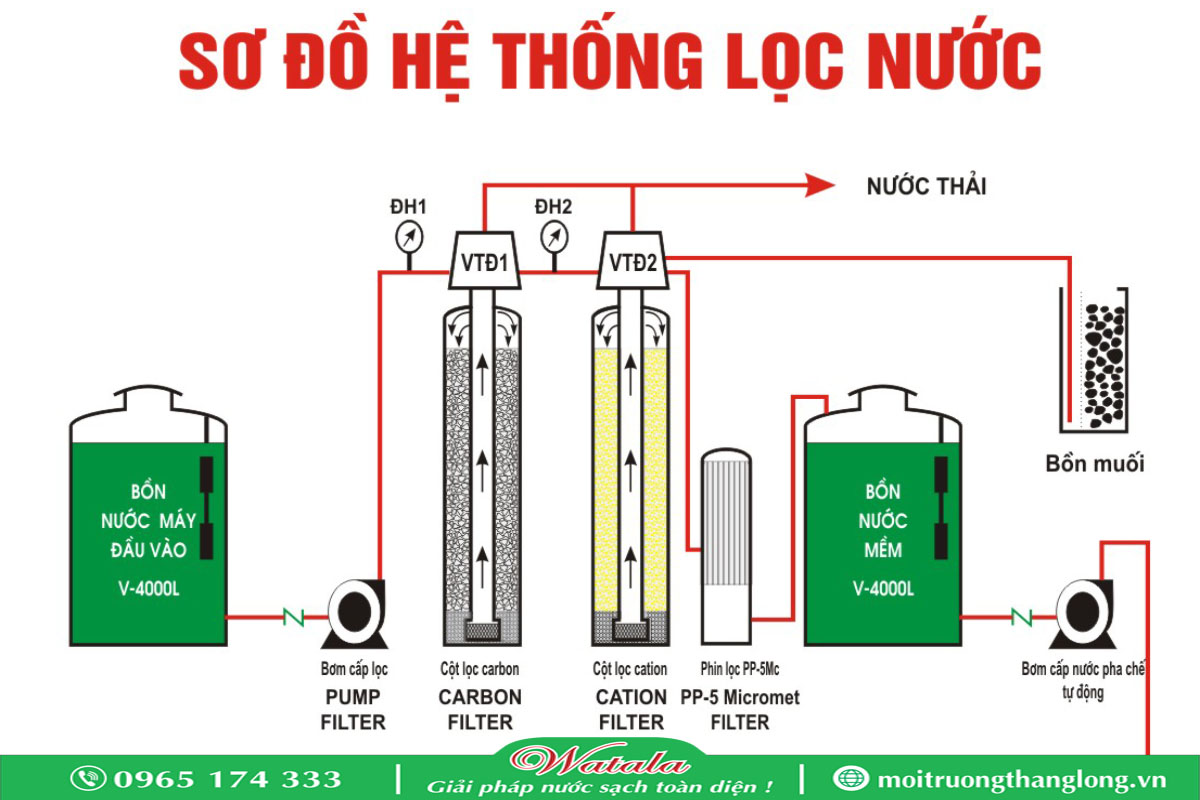 Sơ đồ hệ thống lọc nước mềm, nước nhiễm đá vôi can xi